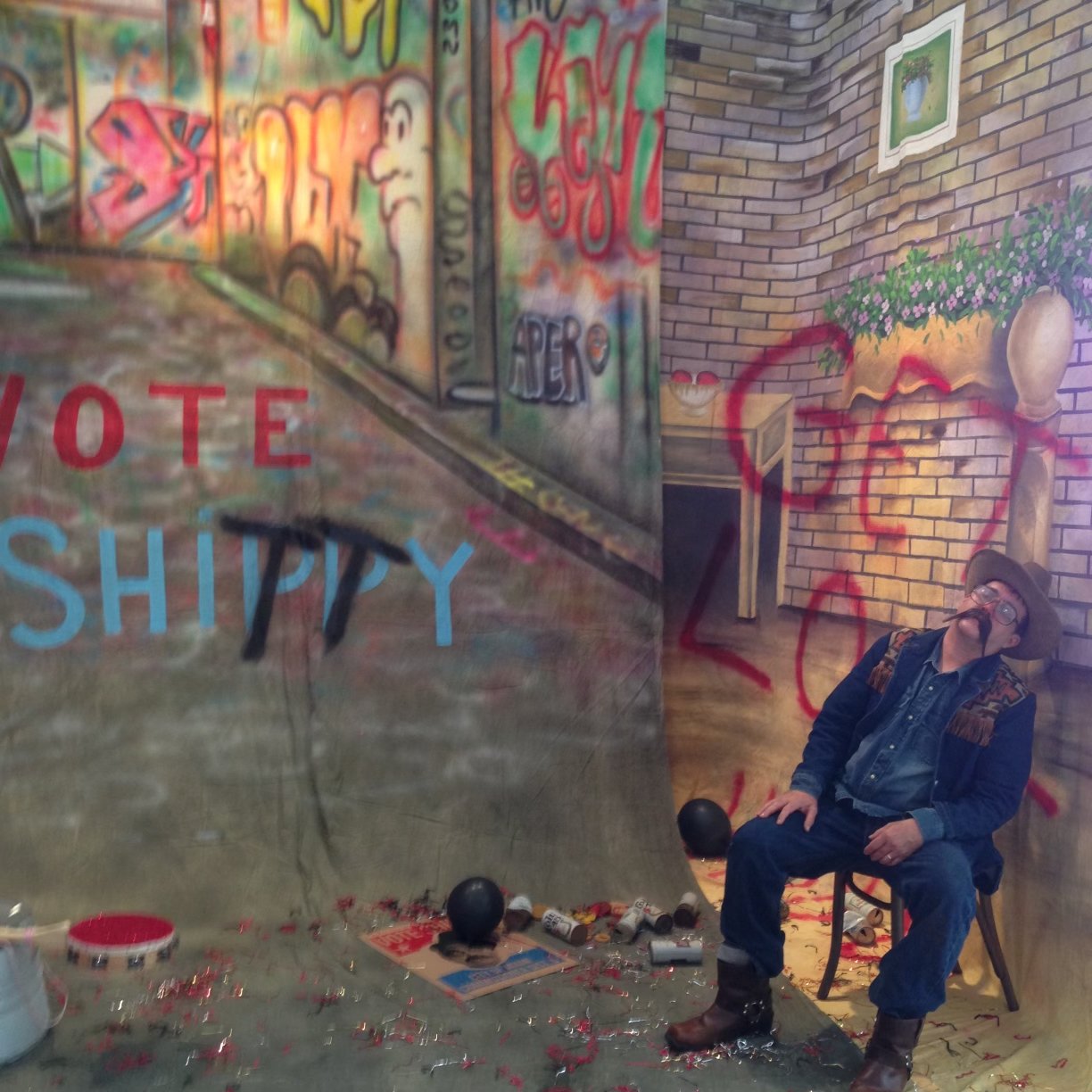 Over the past ten years Childree has produced a number of black and white slapstick films. The characters in these productions are played by an actor named “Shippy”; a persona adopted by the artist. Childree devised Shippy to be a Huey Long-type figure, based on the charismatic and controversial 1930s governor of Louisiana.